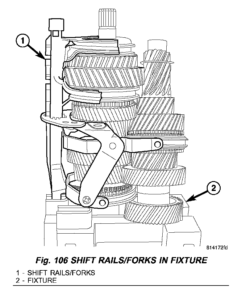 4. Install shift rails and forks (1) onto Fixture 9633 (2) and countershaft/mainshaft. (Fig. 106).