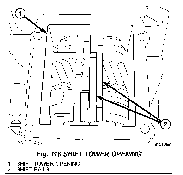 16. Through the shift tower opening (1) (Fig. 116) move two shift rails (2) forward to lock the transmission in two gear.