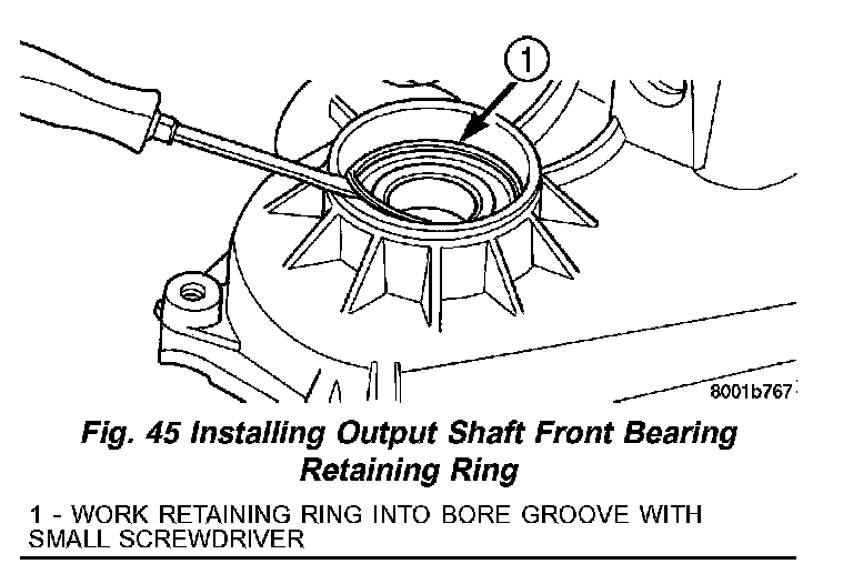 5. Install output shaft front bearing retaining ring (Fig. 45). Start ring into place by hand. Then use small screwdriver to work ring into case groove. Be sure ring is fully seated before proceeding.