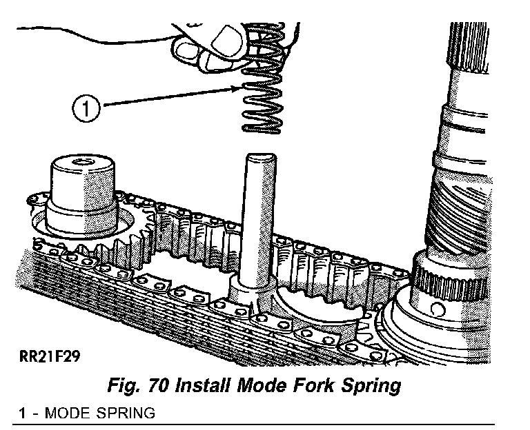 5. Install mode spring on upper end of mode fork shift rail (Fig. 70).