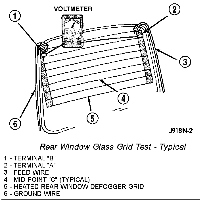 3. If a temperature difference is not detected, use a 12-volt DC voltmeter and contact the rear glass heating grid power feed terminal A with the positive lead, and terminal B with the negative lead. The voltmeter should read battery voltage. If the voltmeter does not read battery voltage, check the following: