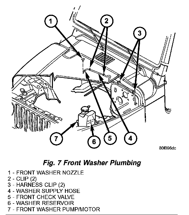 Washer fluid in the washer reservoir is pressurized and fed by the front washer pump/motor through the front washer system plumbing and fittings to the front washer check valve and the front washer nozzle. Whenever routing the washer hose or a wire harness containing a washer hose, it must be routed away from hot, sharp, or moving parts; and, sharp bends that might pinch the hose must be avoided.