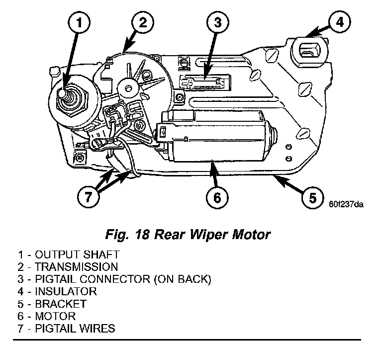 The rear wiper motor is concealed behind a molded plastic trim cover on the inside of the liftglass near the right liftglass hinge at the top of the glass. A large blackout area of the liftglass conceals the unit from the exterior of the vehicle. The end of the motor output shaft that protrudes through a large rubber grommet in the liftglass to drive the rear wiper arm and blade is the only visible component of the rear wiper motor. A large flat washer and a nut secure and seal the motor output shaft to the outside of the liftglass, while a rubber insulator in a slot on the outboard upper corner of the motor bracket is secured by a stud and nut to the inside of the lift- glass near the right liftglass hinge. The connector of a short pigtail harness is secured to a tab on the back of the motor bracket, and connects the rear wiper motor to the vehicle electrical system through a dedicated take out and connector of the hardtop wire harness. The rear wiper motor consists of the following major components:
