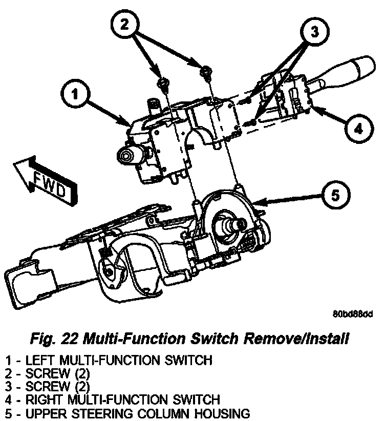 8. Remove the two screws that secure the multifunction switch assembly to the upper steering column housing (Fig. 22).