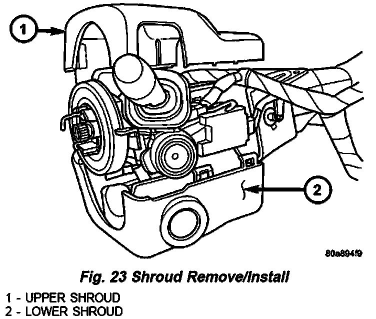 8. Position both the upper and lower shrouds onto the steering column (Fig. 23). Be certain that the locating tabs for the left and right multi-function switch control stalk watershields are properly engaged in the openings of both the upper and lower shrouds.
