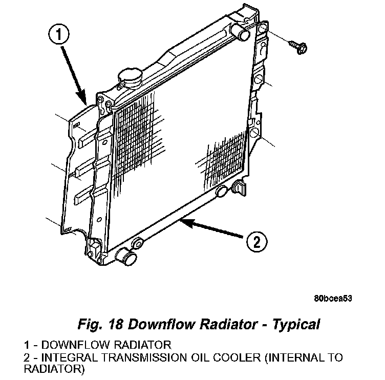 A heavy duty down-flow aluminum/plastic radiator is used. The radiator consists of an aluminum core and plastic end tanks, which are fastened to the core with clinch tabs and sealed with a high temperature rubber gasket. On automatic transmission equipped vehicles, the lower tank contains a concentric-tube transmission oil cooler.