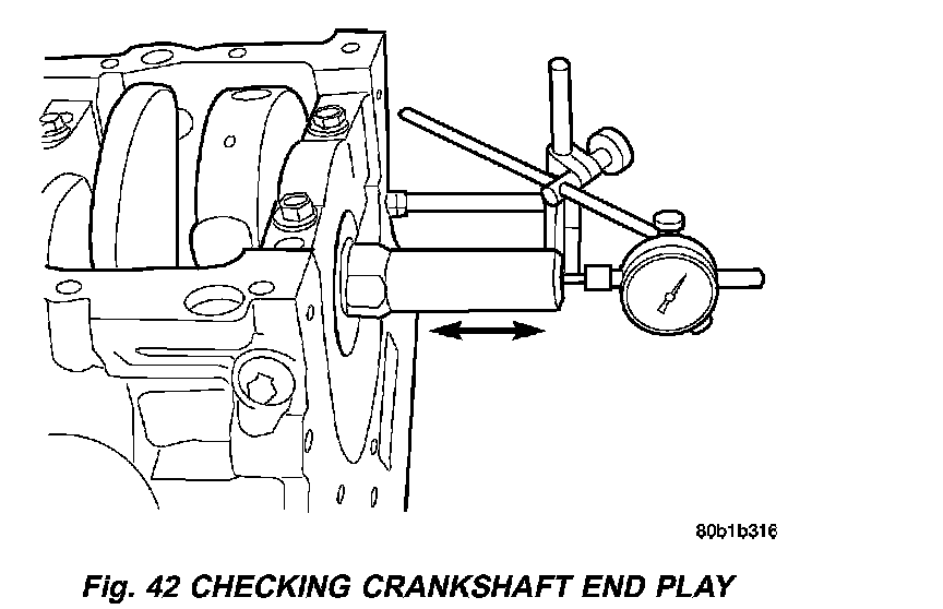 STANDARD PROCEDURE - CRANKSHAFT END PLAY1. Using Dial Indicator C-3339 and Mounting Post L-4438, attach to front of engine, locating probe perpendicular on nose of crankshaft (Fig. 42).