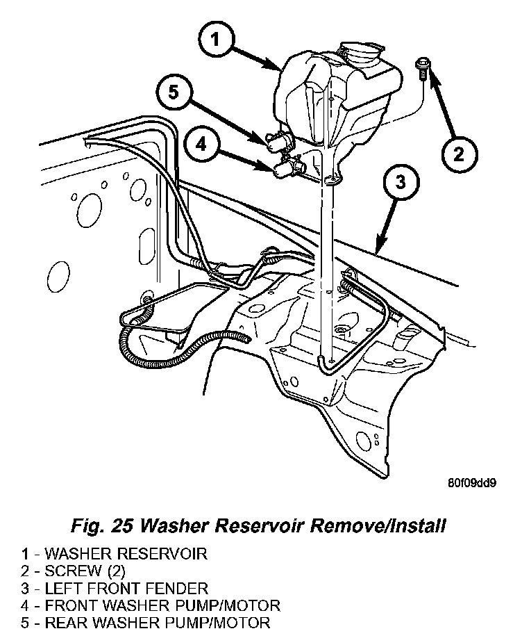 2. Remove the two screws that secure the washer reservoir to the left front fender wheel house.