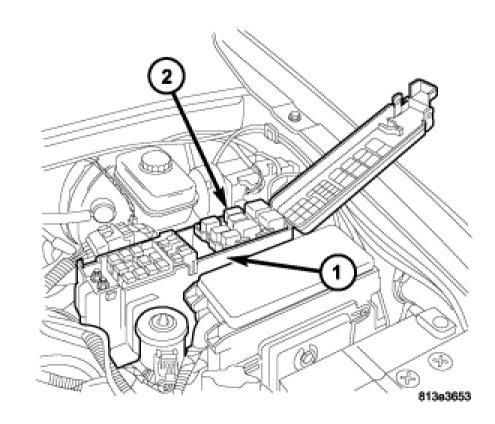 1. Position the A/C clutch relay (2) into the receptacle of the power distribution center (PDC) (1).