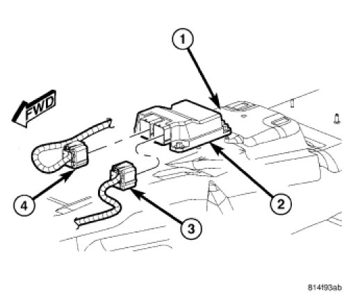 3. Disconnect the instrument panel (3) (C2) and body (4) (C1) wire harness connectors from the Occupant Restraint Controller (ORC) (2) connector receptacles located on the forward facing side of the module. To disconnect the connectors from the ORC: