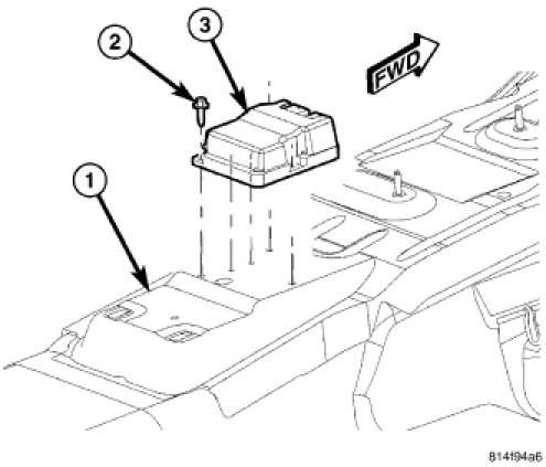 4. Remove the three screws (2) that secure the ORC (3) to the ORC mount welded onto the top of the floor panel transmission tunnel (1).