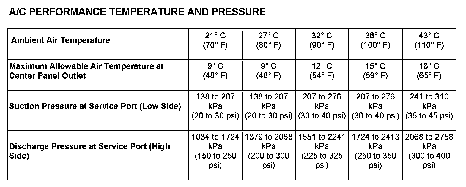 5. With the A/C compressor clutch engaged, compare the air temperature at the center panel outlet and the A/C compressor discharge pressure (high side) to the A/C Performance Temperature and Pressure chart. The compressor clutch may cycle, depending upon the ambient temperature and humidity. If the clutch cycles, use the readings obtained before the clutch disengaged.