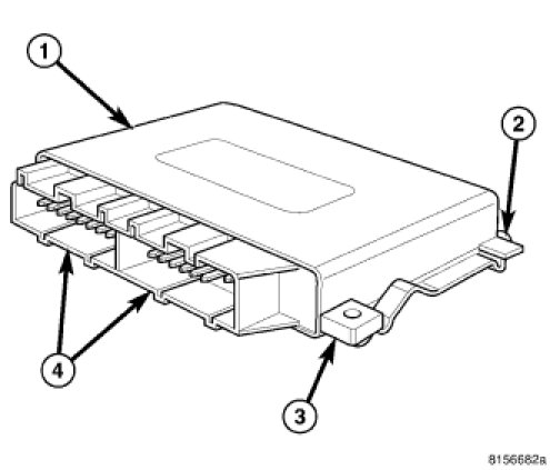 There are four mounting tabs (2 and 3) integral to the module housing that secure the module through two slots and two latch features integral to the floor of the step cavity. Two connector receptacles (4) containing terminal pins that connect the module to the vehicle electrical system are integral to the one side of the housing. One of the receptacles is utilized in vehicles equipped with only the rear park assist system, while both receptacles are used on vehicles equipped with both the front and rear park assist systems.