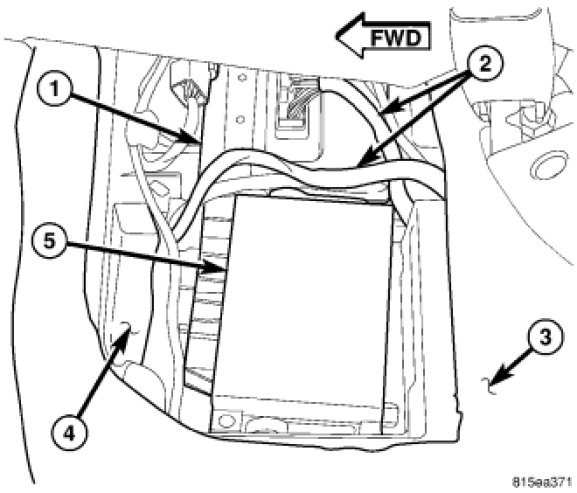 The Park Assist Module (5) is secured within a cavity on the left side of a molded plastic intermediate step assembly (4) located on the rear floor panel (3) under the second row seat cushion. The module is concealed beneath a carpeted trim cover secured by hook and loop fasteners over the step cavity. The inboard side of this cavity also contains the Final Drive Control Module (FDCM) (1) on vehicles that are so equipped. Both modules are connected to the vehicle electrical system through dedicated take outs and connectors of the underbody wire harness (2).