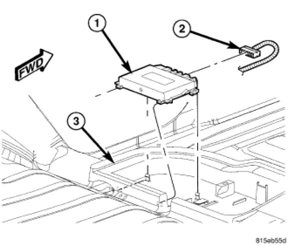 3. Reconnect the underbody wire harness connector (2) to the module connector receptacle. Vehicles with the front park assist option will have a second connection to the module at this location, which must also be reconnected.