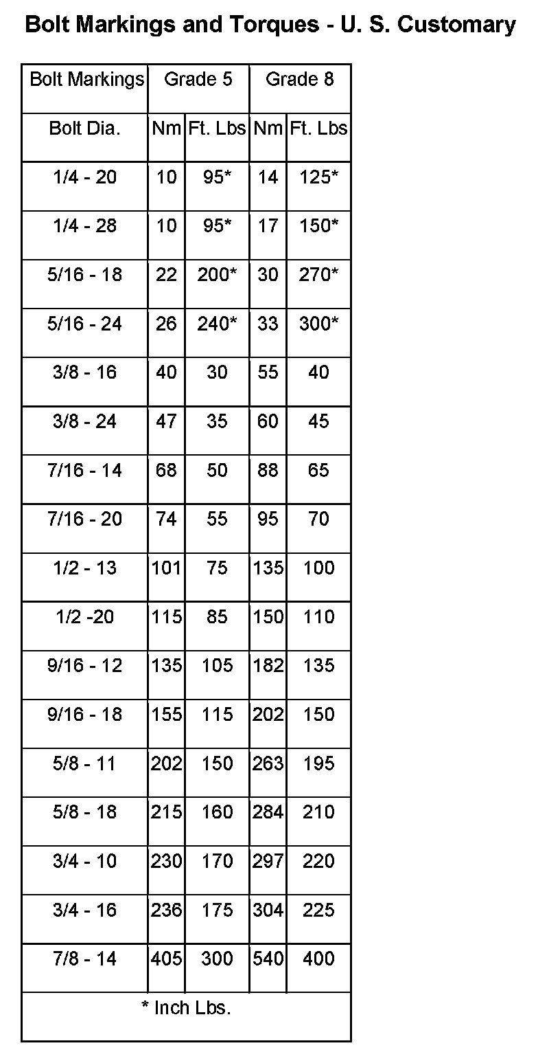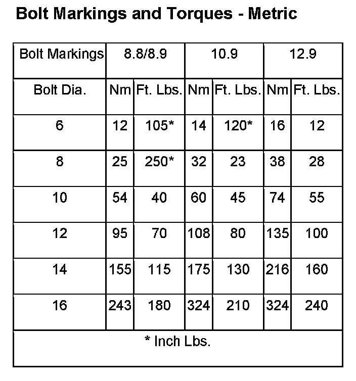 The SAE bolt strength grades range from grade 2 to grade 8. The higher the grade number, the greater the bolt strength. Identification is determined by the line marks on the top of each bolt head. The actual bolt strength grade corresponds to the number of line marks plus 2. The most commonly used metric bolt strength classes are 9.8 and 10.9. The metric strength class identification number is imprinted on the head of the bolt. The higher the class number, the greater the bolt strength. Some metric nuts are imprinted with a single-digit strength class on the nut face. Refer to the Fastener Identification and Fastener Strength Charts.