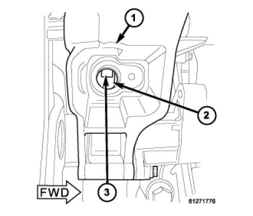 The tonewheel is located at the front of the camshaft (2). As the tonewheel rotates, notches (3) pass through the sync signal generator.
