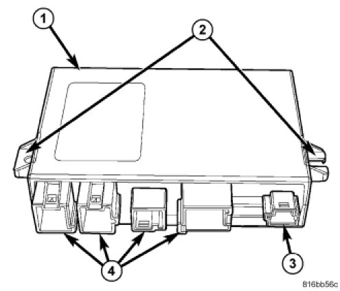 There are two mounting tabs (2) integral to the TM housing are secured by two nuts to two studs integral to the mounting plate. Four connector receptacles (4) containing terminal pins that connect the module to the vehicle electrical system are integral to the one side of the housing. One additional receptacle (3) is not utilized in this application.