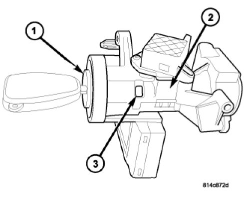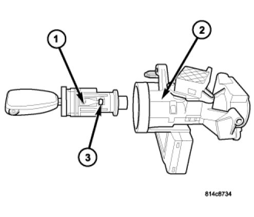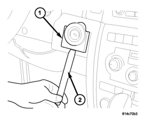 1. Install ignition key into lock cylinder (1). Rotate key to "ON" position (retaining tab on side of lock cylinder (3) can now be depressed).