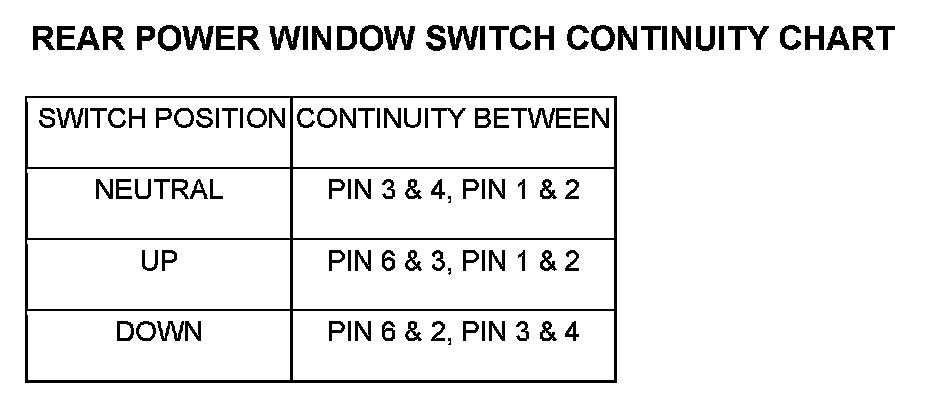 4. Test the power window switch continuity. See the Power Window Switch Continuity chart to determine if the continuity is correct in the Neutral, Up and Down switch positions. If OK, refer to Windows/Testing and Inspection. If not OK, replace the inoperative switch.