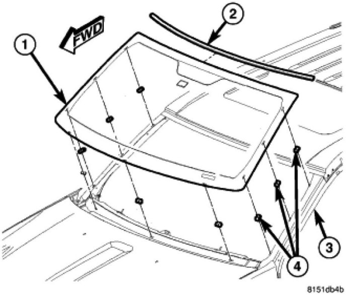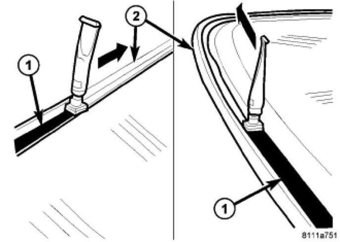 4. Install a new rubber seal (2) along the top of the windshield (1).