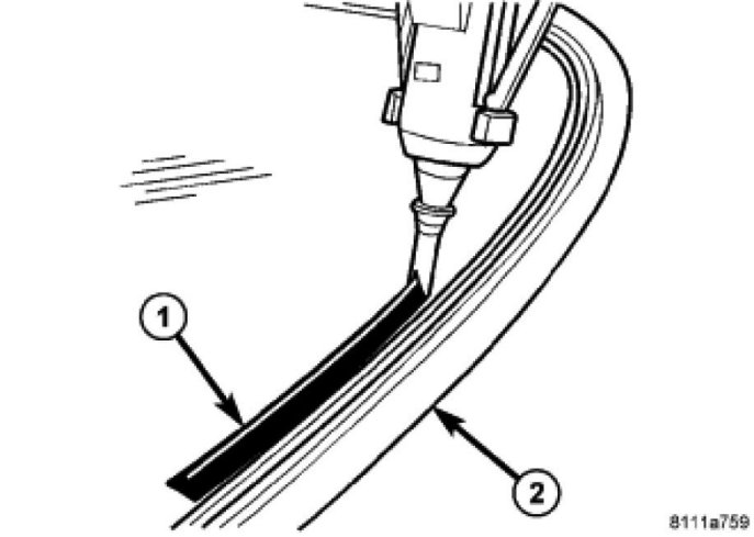 18. Apply approximately a 10 mm (0.4 in.) wide bead of adhesive (1) with a triangular nozzle approximately 6 mm (0.230 in.) from the edge of the glass (2) starting at the bottom center of the windshield.