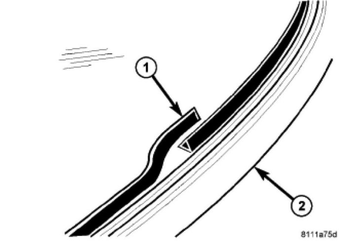 15. Apply pinch weld primer 15 mm (0.75 in.) wide (1) around the windshield fence (2). Allow at least three minutes drying time.