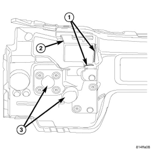 1. Locate the transmission control module on the dash panel, under the dash panel silencer pad (2), just to the right of the steering column.