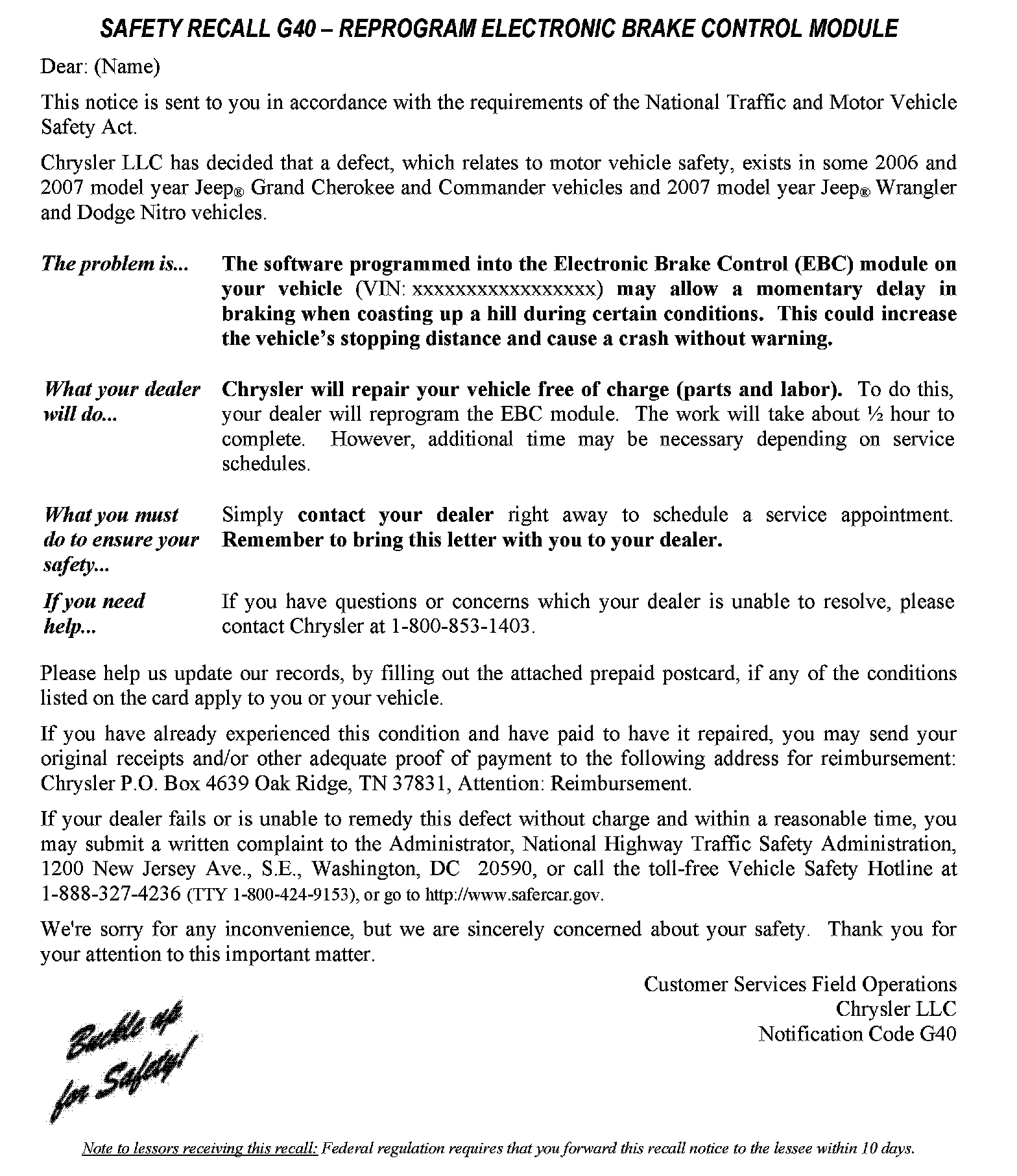 Recall - Electronic Brake Control Module Programming