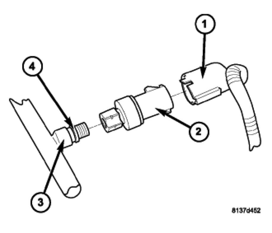 2. Install the A/C pressure transducer (2) onto the A/C discharge line. Tighten the A/C pressure transducer securely.