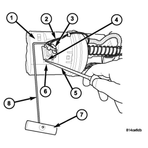 The fuel level sending unit (fuel level sensor) (3) and float assembly (7) and (8) is located on the side of the fuel pump module.