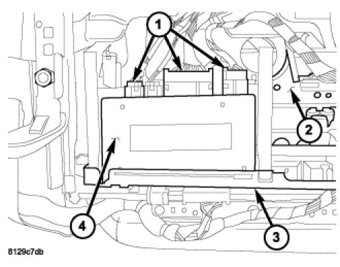 1. Place the module (4) into position making sure the mounting tabs are properly aligned with the front bracket.