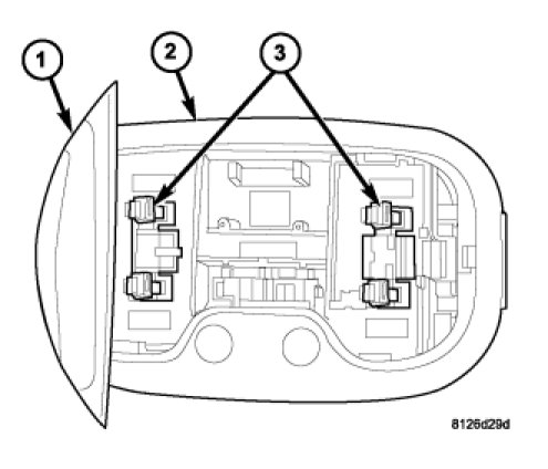1. With the reading lamp lens (1) in the open position, align the ends of the bulb (3) with the two bulb holders within the lamp housing (2).