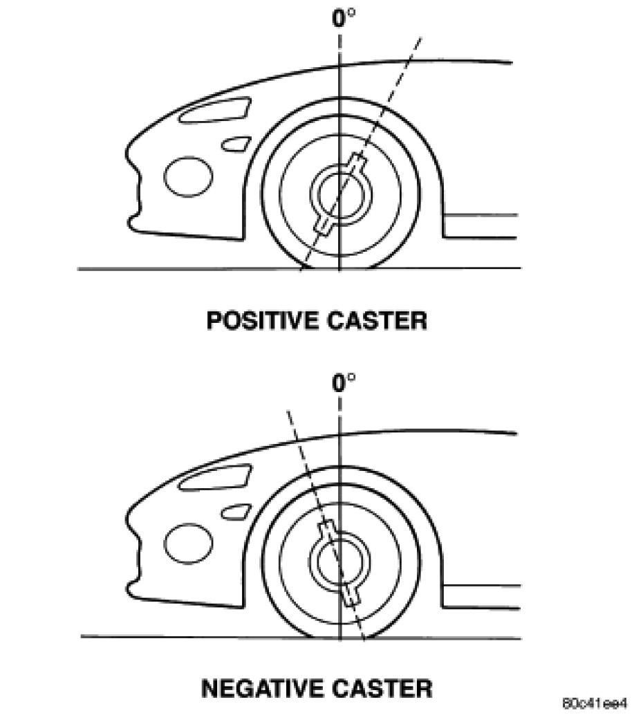 Caster is the forward or rearward tilt of the steering knuckle in reference to the position of the upper and lower ball joints. Caster is measured in degrees of angle relative to a true vertical center line. This line is viewed from the side of the tire and wheel assembly.