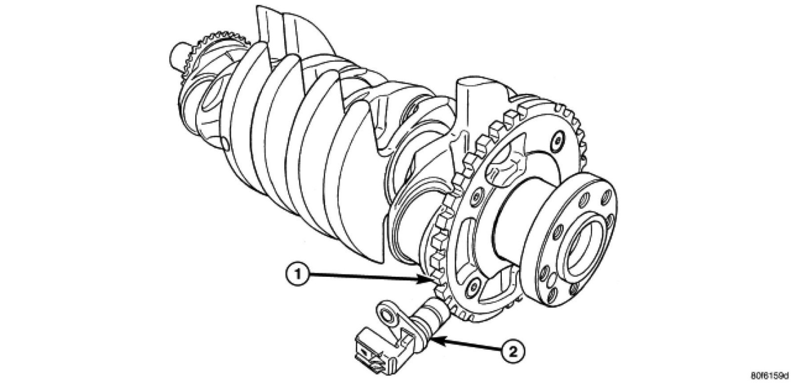 The PCM determines which cylinder to fire from the crankshaft position sensor input and the camshaft position sensor input. The #8 crankshaft counterweight has a target ring with 32 teeth and notches (1), including one long reference tooth and notch. From the crankshaft position sensor input the PCM determines engine speed and crankshaft angle (position).
