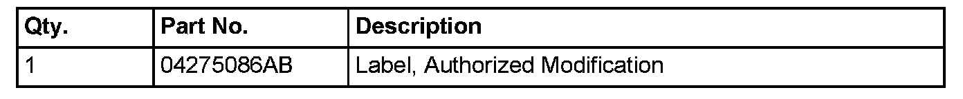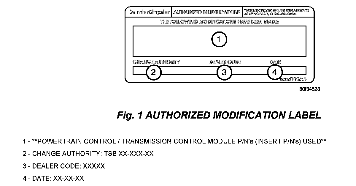 9. Type the necessary information on the "Authorized Modification Label p/n 04275086AB and attach near the VECI label (Fig 1).
