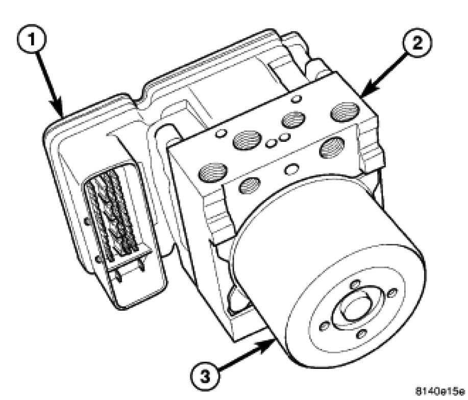 The ABM (1) is mounted to the HCU (2) as part of the Integrated Control Unit (ICU). The ICU is located in the engine compartment on the inboard side of the right body frame rail behind the strut tower. For information on the ICU.