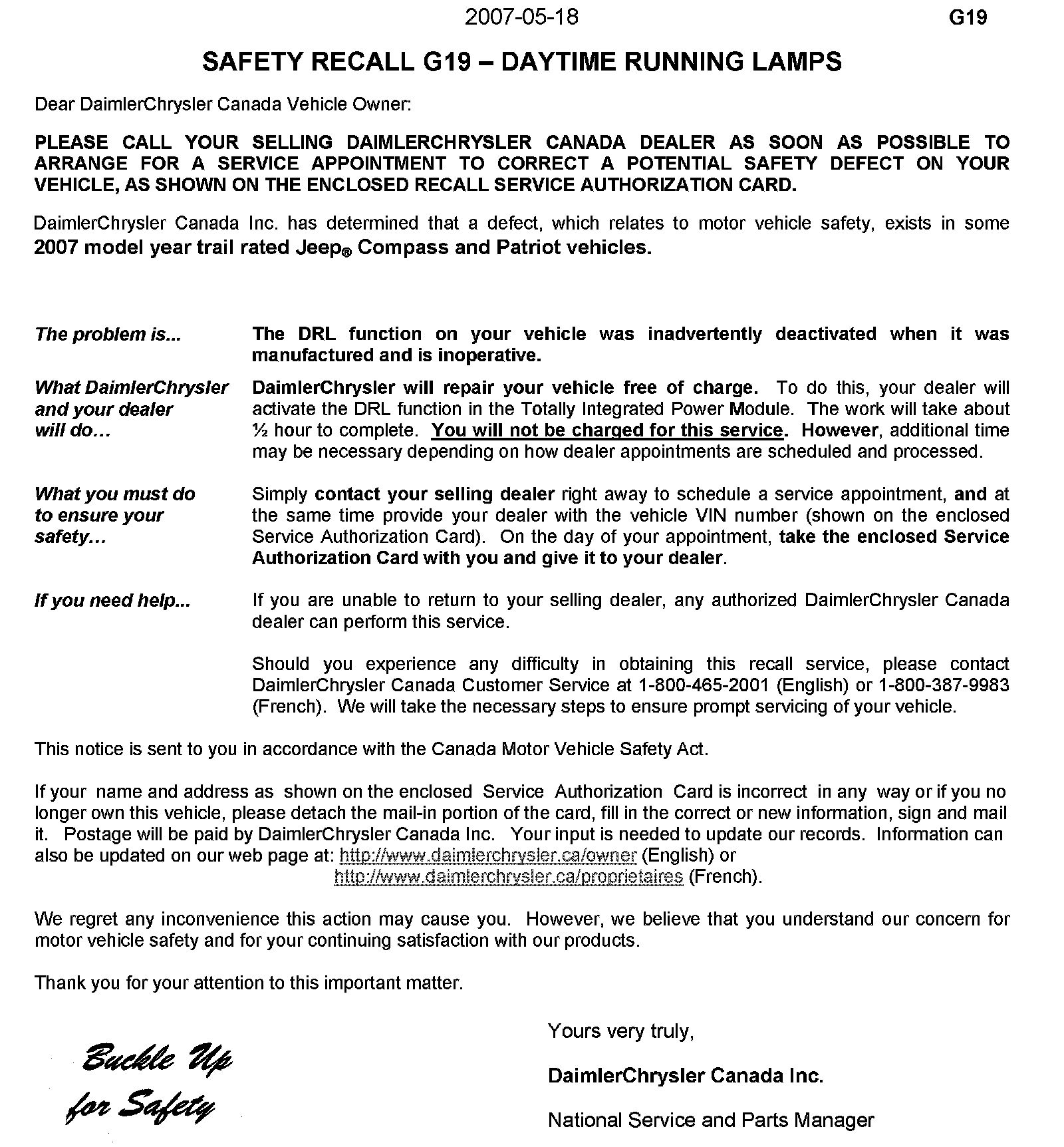 Recall - Daytime Running Lamp Reconfiguration