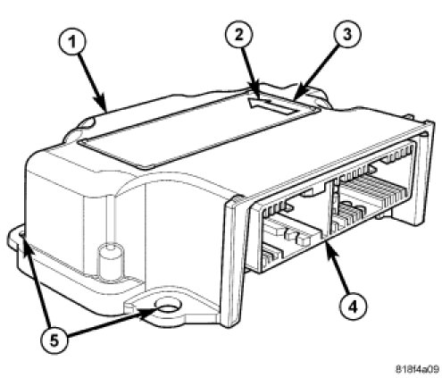 An arrow (2) printed on the label (3) on the top of the ORC housing provides a visual verification of the proper orientation of the unit, and should always be pointed toward the front of the vehicle. The ORC housing has integral mounting flanges (5) on the left front and rear corners and near the center of the right side. A molded plastic electrical connector receptacle (4) exits the rearward facing side of the ORC housing. This receptacle connects the ORC to the vehicle electrical system through two dedicated take outs and connectors from the instrument panel wire harness.