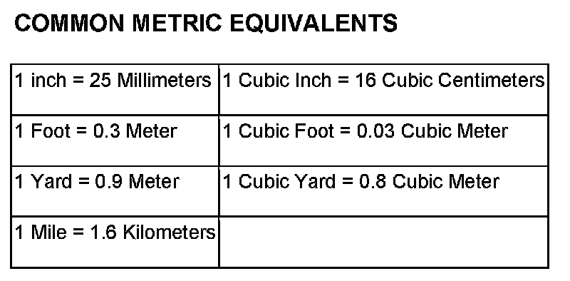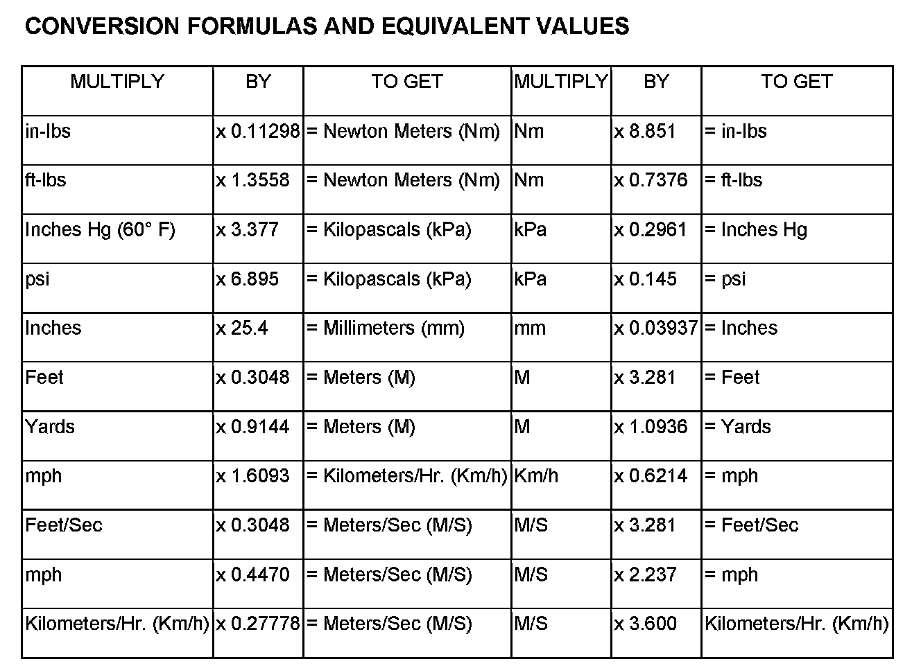 The following chart will assist in converting metric units to equivalent English and SAE units, or vise versa.
