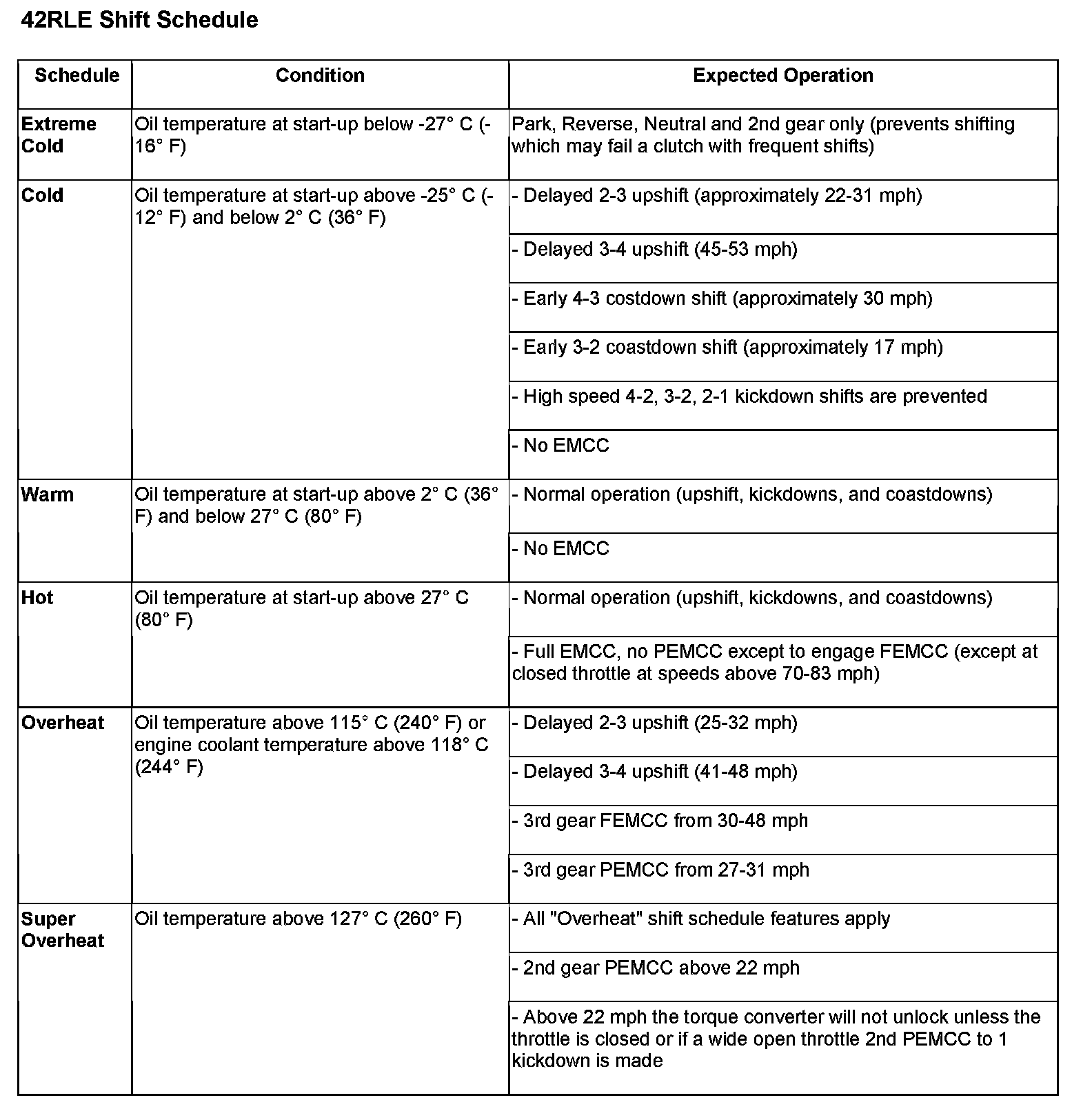 As driving conditions change, the TCM appropriately adjusts the shift schedule. Refer to the following table 42RLE Shift Schedule to determine the appropriate operation expected, depending on driving conditions.