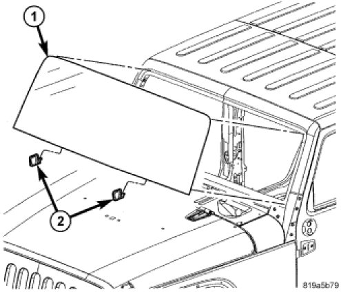 5. Position windshield (1) in center of windshield opening and resting on the lower spacers (2).