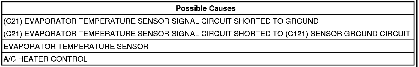 - Repair the (C21) Evaporator Temperature Sensor Signal circuit for a short to ground.
