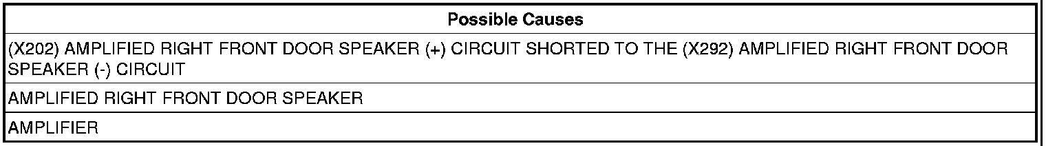 - Repair the (X202) Amplified Right Front Door Speaker (+) circuit, and the (X292) Amplified Right Front Door Speaker (-) circuit for a short together.