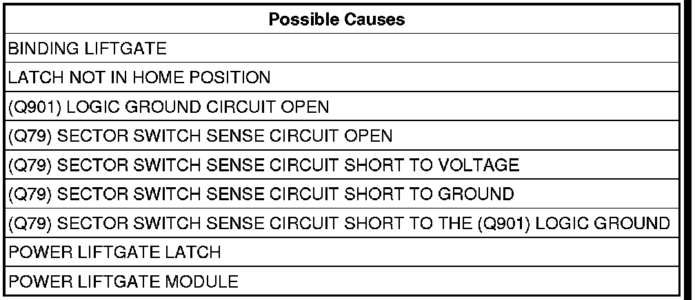 Measure the resistance between the (Q901) Logic Ground circuit and the (Q79) Sector Switch Sense circuit in the Power Liftgate Latch harness connector.