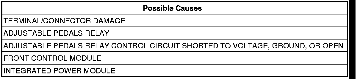 - Repair the Adjustable Pedals Relay Control circuit for a short to ground.