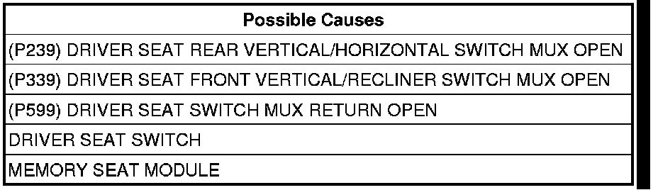 - Repair the (P239) Driver Seat Rear Vertical/Horizontal Switch MUX circuit for an open.