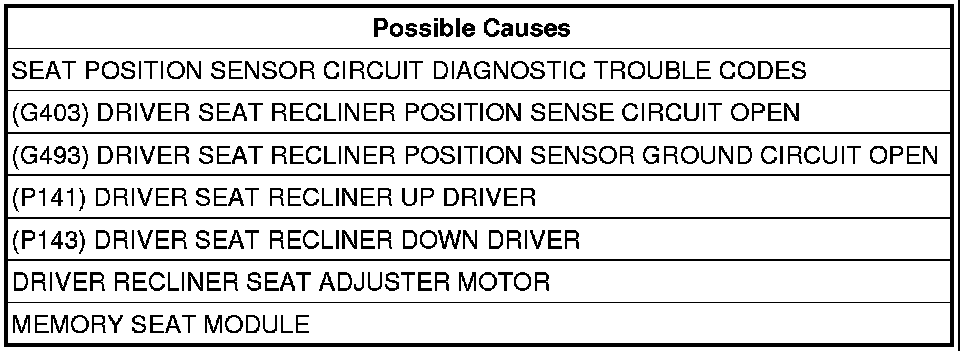 - Repair the (G403) Driver Seat Recliner Position Sense circuit for an open.