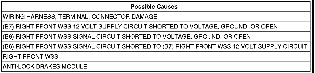 - Repair the (B6) Right Front WSS Signal circuit for a short to voltage.