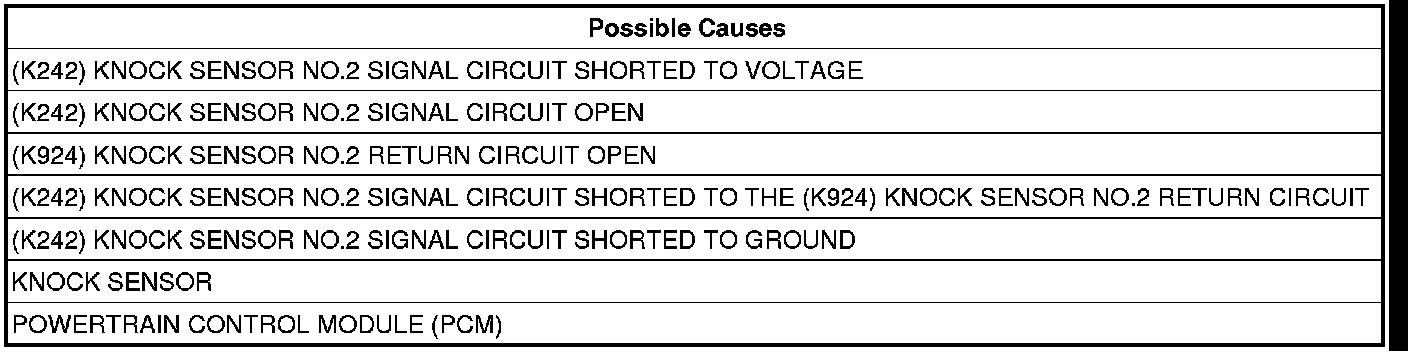 - Repair the short between the (K242) Knock Sensor No.2 Signal circuit and the (K924) Knock Sensor No.2 Return circuit.